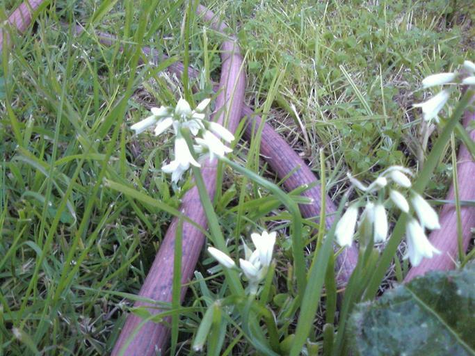 Keywords: Whiteflowerflorblanca.jpg foto por celular que tomé de una flor en mi patio entre el pasto u una manguera Own 2008-03-22 Qrc2006 libro ésta imágen para cualquier uso cuandosea por culaquiera y al dominio público libero todos los derechos Allium triquetrum |