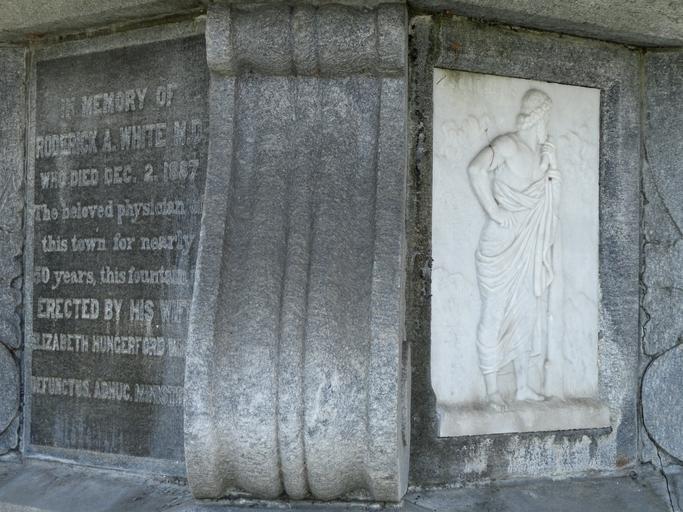 Keywords: White Memorial Fountain relief - Weatogue, Connecticut - DSC09351.JPG en White Memorial Fountain - Weatogue village Simsbury Connecticut USA Dedicated in September 1892 in honor of Dr Roderick A White Artist s unknown; granite quarried in Monson Massachusetts by the W N Flynt Granite Company Inscription In Memory of Roderick A White M D who died Dec 2 1887 The beloved Physician of this town for nearly fifty years Erected by his wife Elizabeth Hungerford White Defunctus adhunc ministrant This artwork is in the public domain because the artist died more than 70 years ago 2013-04-21 13 16 08 own Daderot cc-zero White Memorial Fountain Uploaded with UploadWizard |