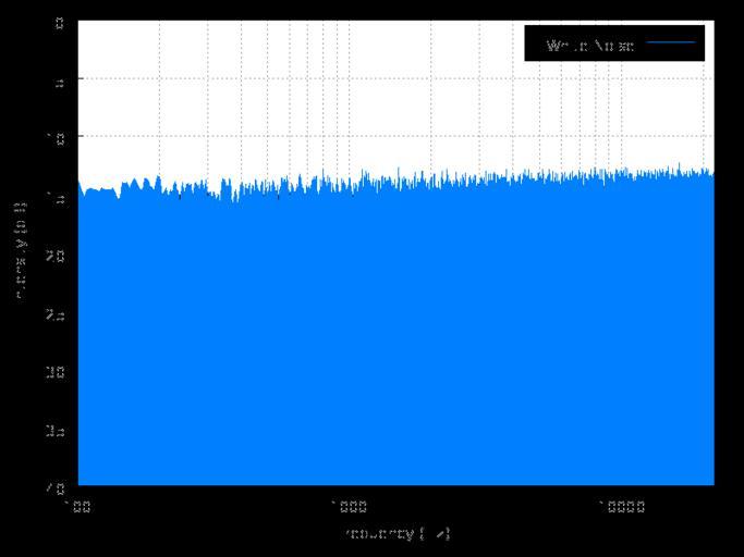 | Keywords: White noise spectrum.png Spectrum analysis of uncompressed source for White noise ogg 10 seconds of white noise Note the logarithmic frequency scale The analysis was done using Audacity and plotting with gnuplot Transparency was touched up in GIMP to make the graph background pure white I find the log frequency plot here confusing as it suggests that white noise may rise slightly with increasing frequency A linear frequency scale would be better However for comaprison with pink noise having the log frequency plot keeps the frequency axis on both the same White noise spectrum svg Instructions Obtain the frequency analysis from Audacity set the maximum number of windows and use a Hamming window The following script was used to generate the image n set terminal png transparent font /usr/share/fonts/truetype/ttf-bitstream-vera/Vera ttf size 800 600 enhanced set output white_noise_spectrum png this seems to fix the trailers on the TTF font for the x-label set bmargin 4 enable grid set grid set grid mxtics set up x-axis set logscale x 10 set xrange 100 22000 set xlabel Frequency Hz set xtics border nomirror set up y-axis set yrange -40 0 set ylabel Intensity dB set ytics border nomirror again to deal with bad bboxes on the TTF set key height 1 box plot the output from Audacity plot white_noise txt title White Noise with filledcurves x1 3 White noise |