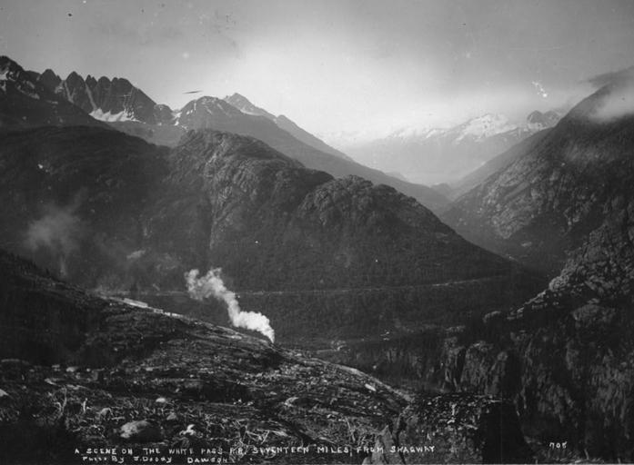 Keywords: White Pass Old photo.jpg White Pass Railroad train seventeen miles from Skagway http //hdl loc gov/loc pnp/ppmsc 01636 between ca 1900 and ca 1930 Doody J PD-USGov PD-USGov White Pass and Yukon Route rolling stock