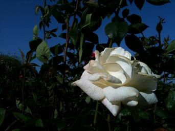 Keywords: white roses flowers blossoms blooms blooming flowering plants green leaves leafy stems blue sky bright petals fleurs rose gardens gardening wild gardens decorative ornamental