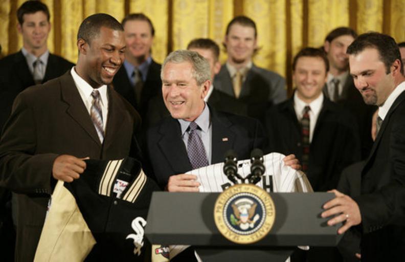 | Keywords: WhiteSox President.jpeg Members of the Chicago White Sox baseball team meeting with U S President George W Bush Jermaine Dye left and Paul Konerko right are presenting the President with a jersey http //www whitehouse gov/news/releases/2006/02/images/20060213-3_d-0569-515h html 2006-02-13 White House photographer Eric Draper Public domain work of U S Gov't PD-USGov 2005 World Series George W Bush in 2006 20060213 George W Bush with sportspeople 20060213 Jermaine Dye Paul Konerko Photographs by Eric Draper |