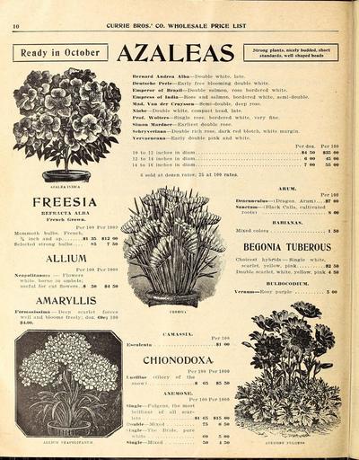 | Keywords: Wholesale price list (15752421454).jpg 10 <br> CURRIE BROS ' CO WHOLESALE PRICE LIST <br> Ready in October <br> AZALEAS <br> strong plants nicely budded short <br> standards well shaped heads <br> Bernard Andrea Albsi Double white late <br> Deutsche Perle Early free blooming double white <br> Emperor of Brazil Double salmon rose bordered white <br> Empress of India Rose and salmon bordered n hite semi-double <br> Mad Van der Cruyssen Semi-double deep rose <br> Niobe Double white compact head late <br> Prof AVolters Single rose bordered white very fine <br> Simon Mardner Earliest double rose <br> Seliryveriana Double rich rose dark red blotcli wiiite margin <br> Vervaeneana Early double pink and white <br> Per doz <br> 10 to 12 inches in diam 4 50 <br> 12 to 14 inches in diam 6 00 <br> 14 to 16 inches in diam 7 00 <br> 6 sold at dozen rates; 25 at 100 rates <br> Per 100 <br> 35 00 <br> 45 00 <br> 55 00 <br> AZALEA INDICA <br> FREESIA <br> REFRACTA AI BA <br> French Grown <br> Per 100 Per 1000 <br> Mammoth bulbs Frencli <br> inch and up 135 12 00 <br> Selected strong bulbs 85 7 50 <br> ALLIUM <br> Per 100 Per 1000 <br> Neapolitani Flowers <br> wliite borne in umbels; <br> useful for cut flowers 50 4 50 <br> AMARYLLIS <br> Forni»Ni sNiuia Deep scarlet forces <br> well and blooms freely; doz GOo; 100 <br> 4 00 <br> ALLII'M NEAI'OLITANTM <br> CAMAS SI A <br> Per 100 <br> Kseulenta 1 00 <br> CHIONODOXA <br> Per 100 Per 1000 <br> l ncillae Glory of the <br> snow 65 5 50 <br> ANEMONE <br> Per 100 Per 1000 <br> Single Fulgens the most <br> brilliant of all scar- <br> lets 1 65 15 00 <br> rjouhle Mixed 75 6 50 <br> single The Bride pure <br> white 60 5 00 <br> Single Mixed 50 4 50 <br> ARUM <br> Per 100 <br> Draeunoulus Dragon Arum 7 00 <br> Sanctum Black Calla cultivated <br> roots 8 00 <br> BABIANAS <br> Mixed colors <br> 1 50 <br> BEGONIA TUBEROUS <br> Choicest hybrids Single white <br> scarlet yellow pink 3 50 <br> Double scarlet white yellow pink 4 50 <br> BULBOCODIUM <br> Vernum Rosy purple 5 00 <br> ANE MONE FL'LGENS 42212825 133036 66130 Page 10 Text http //www biodiversitylibrary org/page/42212825 1905 10 5962/bhl title 66130 Currie Brothers Company ; Henry G Gilbert Nursery and Seed Trade Catalog Collection NameFound ALLIUM NameConfirmed Allium EOLID 11378177 NameBankID 2662323 NameFound Azalea indica NameConfirmed Azalea indica L EOLID 5251133 NameBankID 1779497 NameFound Begonia NameConfirmed Begonia aff palmata GBG 002-089-95 EOLID 11904651 NameFound Bulbocodium NameConfirmed Bulbocodium EOLID 13034220 NameBankID 3494609 NameFound Chionodoxa NameConfirmed Chionodoxa Boiss EOLID 1392558 NameBankID 471207 NameFound Draeunoulus NameFound Freesia refracta NameConfirmed Freesia refracta EOLID 11336544 NameBankID 2773643 Biodiversity Heritage Library Currie Bros Co Wholesale price list autumn 1905 Garden Stories Bulbs Plants Catalogs Equipment and supplies Flowers Gardening Nurseries Horticulture Plants Ornamental Seeds U S Department of Agriculture National Agricultural Library bhl page 42212825 dc identifier http //biodiversitylibrary org/page/42212825 bhlGardenStories BHLinbloom bulbs plants nurseries horticulture plants ornamental u s department of agriculture national agricultural library bhlgardenstories bhlinbloom Information field Flickr posted date ISOdate 2015-01-26 CC-BY-2 0 BioDivLibrary https //flickr com/photos/61021753 N02/15752421454 2015-08-25 05 51 57 cc-by-2 0 PD-old-70-1923 Wholesale price list Photos uploaded from Flickr by Fæ using a script |