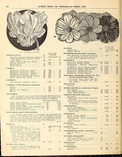 Keywords: Wholesale price list (15752437414).jpg 20 <br> CURRIE BROS ' CO WHOLESALE PRICE LIST <br> NEM- PEATBEBED CYCLAMEN <br> Trade Pkt <br> CONVOLVULUS oz of about <br> Imperial Japanese Morning Glory 20 200 seeds 10 <br> Imperial Fringed Japanese Morn- <br> ing Glory 30 200 ;; 20 <br> Major Mixed Morning Glory 10 _ ˘ ˘ ˘ <br> Aureus Superbus 200 10 <br> Mauritanicus 50 200 10 <br> Minor Mixed 10 <br> COSMOS <br> Mammoth Perfection White 25 500 10 <br> Mammoth Perfection Pink 25 500 10 <br> Mammoth Perfection Crimson 25 500 10 <br> Mammoth Perfection Mixed 20 500 10 <br> Dwarf Early Flowering Dawn 25 500 10 <br> Early Flowering mixed 25 500 10 <br> CYPERUS <br> Alternifolius Umbrella Plant 1 000 10 <br> CYPRESS VINE Ipomoea aiiamoclit <br> Scarlet 500 10 <br> White 500 10 <br> Scarlet Ivy Leaved 500 10 <br> Mixed 500 10 <br> CYCLAMEN <br> Our Cyclamen seed is grown from the finest selected <br> prize varieties and plants grown from our seed have <br> been awarded the first premium wherever exhibited <br> 100 seeds 1 000 seeds <br> Giant Pure White 65 5 00 <br> Giant Pale Pink Daybreak color 65 5 00 <br> Giant Dark Rose 65 5 00 <br> Giant Large White with Crimson Eye 65 5 00 <br> Giant Bright Crimson 65 5 00 <br> Giant Finest Mixed of above 65 5 00 <br> CYCLAMEN NEAV FEATHERED <br> An entirely new strain of Cyclamen of unsurpassing <br> beauty The flowers are large with a distinct Crest or <br> Feather on the face of each petal the feather adding <br> very much to the lasting qualities and cannot fail to ex- <br> cite the admiration of all lovers of the Cyclamen <br> White rose Each per 100 seeds 2 00 <br> DAHLIA OZ <br> Mixed Double 250 seeds 20 <br> Fine Single Mixed 250 10 <br> Cactus Finest Mixed excellent <br> cut flowers 250 15 <br> Twentieth Century A single va- <br> riety -which has been quite the <br> rage in the Eastern cities <br> bringing prices equal to good <br> roses Color rose passing to <br> crimson As the season ad- <br> vances becoming a soft rosy <br> white 1 00 250 25 <br> DAISY New Shasta <br> A beautiful perennial Marguerite <br> white flowers excellent for <br> decorative work 500 25 <br> DATURA <br> Cornucopia <br> Double Mixed <br> DELPHINIUM Perennial Larkspur <br> New Hybrids in splendid mixture <br> Our strain of these has been <br> saved from a named collection <br> DIANTHUS <br> Chinensis Double Mixed <br> Chinensis Double White <br> Heddewigii Double Mourning <br> Cloak <br> Heddewigii Finest Single Mixed <br> Laciniatus Single Fine Mixed <br> Laciniatus Double Mixed <br> Plumarius Pheasant's Eye <br> Plumarius Double Mixed <br> DIANTHUS PLUMARIS NANUS PL PL <br> Double DvFarf Erfurt Pink <br> A beautiful class early and free <br> flowering including very fine <br> red shades <br> DRACAENA <br> Indivisa <br> ES CH S CHOLTZI A California Poppy <br> Fine Mixed <br> The Golden West <br> Bush Hunnemanni <br> FORGET-ME-NOT BIyosotis <br> Palustrus <br> Dissitiflora One of the finest for <br> Florists <br> Quick and Everflowering Flow- <br> ering in 6 to 8 weeks from time <br> of sowing <br> GAILLARDIA <br> Picta Lorenziana <br> Grandiflora Hybrida <br> New Perennial Hybrids; <br> tiful class <br> 15 <br> 40 <br> 40 <br> a beau- <br> GERANIUM <br> Zonal Single Mixed <br> Zonal Double Mixed <br> Pelargorium Lady Washington <br> mixed <br> Apple Scented <br> GLOXINIA <br> Extra Choice Mixed <br> GODETIA <br> Fine Mixed <br> GOMPHRENA Globe Amaranth <br> Red or White each <br> Mixed <br> GOURDS Ornamental <br> Wild Cucumber <br> Dish Rag or Chinese Loofa <br> Mixed many varieties <br> GREVILLEA <br> Robusta <br> GYPSOPHILA <br> Paniculata <br> Muralis <br> Trade Pkt <br> of about <br> 100 seeds 10 <br> 100 10 <br> 500 <br> 1 000 <br> 200 <br> 1 000 <br> 1 000 <br> 1 000 <br> 1 000 <br> 1 000 <br> 1 000 <br> 1 000 <br> 1 000 <br> 1 000 <br> 100 <br> 100 <br> 100 <br> 100 <br> 1 000 <br> 25 <br> 20 <br> 1 000 <br> 05 <br> 30 <br> 1 000 <br> 05 <br> 50 <br> 1 000 <br> 10 <br> 40 <br> 1 000 <br> 10 <br> 30 <br> 1 000 <br> 10 <br> 50 <br> 1 000 <br> 10 <br> 1 000 <br> 10 <br> 1 000 <br> 20 <br> 500 <br> 500 <br> 500 <br> 25 <br> 10 <br> 05 <br> 10 <br> 10 <br> 15 <br> 16 <br> 15 <br> 10 <br> 10 <br> 10 <br> 15 <br> 75 <br> 75 <br> 20 <br> 35 <br> 10 42212815 133036 66130 Page 20 Text http //www biodiversitylibrary org/page/42212815 1905 10 5962/bhl title 66130 Currie Brothers Company ; Henry G Gilbert Nursery and Seed Trade Catalog Collection NameFound Alternifolius NameFound Aureus NameFound Convolvulus NameConfirmed Convolvulus EOLID 60669 NameBankID 3874914 NameFound Cyperus NameConfirmed Cyperus EOLID 29130 NameBankID 2576446 NameFound Datura NameConfirmed Datura L EOLID 8762055 NameFound Dianthus NameConfirmed Dianthus EOLID 11254753 NameBankID 2646562 NameFound Dianthus plumaris NameFound Dissitiflora NameFound Dracaena NameConfirmed Dracaena Daudin 1802 EOLID 83827 NameFound Gaillardia NameConfirmed Gaillardia Foug EOLID 38325 NameFound Gloxinia NameConfirmed Gloxinia L'Her EOLID 72184 NameFound Godetia NameConfirmed Godetia EOLID 5466836 NameBankID 3471363 NameFound Gomphrena NameConfirmed Gomphrena EOLID 50431 NameBankID 2646957 NameFound Grandiflora NameFound Grevillea NameConfirmed Grevillea 'Robyn Gordon' EOLID 60829 NameFound Gypsophila NameConfirmed Gypsophila EOLID 59327 NameBankID 2646576 NameFound Hybrida NameConfirmed Hybrida NameBankID 5327990 NameFound Ipomoea NameConfirmed Ipomoea sp cdK153 EOLID 23770052 NameFound Laciniatus NameFound Lorenziana NameConfirmed Lorenziana NameBankID 5328378 NameFound Mauritanicus NameConfirmed Mauritanicus NameBankID 5138734 NameFound Muralis NameConfirmed Muralis NameBankID 5333080 NameFound Nanus NameConfirmed Nanus EOLID 73713 NameBankID 2610066 NameFound Palustrus NameFound Paniculata NameFound Pelargorium NameFound Picta NameConfirmed Picta NameBankID 5100567 NameFound Plumarius NameConfirmed Plumarius EOLID 12072735 NameBankID 4303501 NameFound Robusta NameConfirmed Robusta NameBankID 4332975 NameFound Su