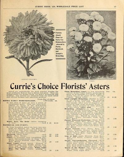 Keywords: Wholesale price list (15754878543).jpg CURRIE BROS ' CO WHOLESALE PRICE LIST <br> 17 <br> Florists <br> should <br> Plant for <br> Early Use <br> Hohenzollern <br> olio wed by <br> Purity <br> Daybreak <br> and <br> Semple's <br> Branchiag <br> SKMPLE S ERANi HlNi; <br> Currie's Choice <br> Asters are undoubtedly the most popular besides the <br> most profitable flowers that a florist can grow They are <br> indispensable for design work cut flower decoration and <br> bedding Our strains are obtained from the most noted <br> and careful German and American growers <br> Trade Pkt of about <br> BXTRA EARLY HOHENZOLLERN 1 000 seeds OZ <br> In this class of Aster we have a strain of <br> exceptional merit They are extra early <br> coming in ahead of the well-known <br> Queen of the Market and at least 2 or 3 <br> weeks in advance of the ordinary Asters <br> The flowers are similar in form and size <br> to a good Comet Aster; very durable and <br> do not show their centers so readily as <br> the Comet sorts do; the stems are stout <br> and long making them excellent for cut <br> flower work This is -without doubt the <br> Aster for early cutting and one invalu- <br> able to florists <br> White Rose The Bride white changing <br> to rose each 25 2 50 <br> DAYBREAK AND PURITY <br> In these beautiful Asters we have two rare <br> gems for Florists' use The flowers are <br> round as a ball large and full borne on <br> long stems They are continuous bloom- <br> ers and desirable acquisitions <br> Daybrealt Shell Pink each 25 1 50 <br> Purity Pure White each 25 2 50 <br> Comet ” A beautiful class resembling Jap- <br> anese Chrysanthemums in form Snow <br> White Peach Blossom Light Blue Deep <br> Rose iVIixed each 20 1 50 <br> Giant Comet ” Grand Asters Flowers of <br> immense size very double petals long <br> wavy and twisted very graceful and <br> borne on long stout stems White Light <br> Blae The Bride white passing to <br> rose each 20 1 25 <br> Florists' Asters <br> Giant BraDChing Comet- A new branching Pkt Oz <br> variety of the Comet family producing as <br> many as 50 blossoms to a plant height 18 <br> inches has all the grace of the old-time <br> Comets Mixed colors each 20 1 25 <br> Giant Upright Brandling ” Similar in habit <br> to the Paeony Flowered type gro wing <br> about 2 to 2 feet high Flowers are <br> very double after stj'le of Semple's pro- <br> duced on long stems growing nearly up- <br> right which permits of close planting; <br> in two colors vliite pink each 20 1 00 <br> Branching Seinples ” A late flowering <br> Aster of strong branching habit bearing <br> flowers on long stout stems The petals <br> are twisted or waved and of remarkable <br> size valuable for design work floral dec- <br> orations etc Should be grown by all <br> florists White Lavender Pink Rose <br> Blue Mixed each 15 1 0 k <br> Paeony PloTvered Perfection ” White Peach <br> Blossom Light Blue Scarlet Rose and <br> White Crimson Carmine and White <br> Black Blue Azure Blue with White Deli- <br> cate Rose Purple Violet and White Pur- <br> ple Mixed each 25 1 50 <br> Dwarf Victoria ” Pure White Rose and <br> White Crimson Scarlet Purple-Violet <br> Carmine Rose Light Blue Edged White <br> White Tinted Rose Light Blue Peach <br> Blossom Mixed each 25 2 50 <br> Gem or Ball ” Apple Blossom Deep Rose <br> Rose and White Crimson Light Blue <br> Mixed each 20 1 50 <br> Dwarf Chrysanthesnum Flowered ” SnOTV <br> White Flesh Color Bright Scarlet Por- <br> celain Blue White to Azure Blue Dark <br> Blue Deep Carmine Edged White Bright <br> Rose Rosy Pink Crimson Mixed each 25 1 75 <br> lueen of the Market ” The earliest of all <br> the Asters; very useful for cutting <br> White Pink Light Blue each 10 60 42212818 133036 66130 Page 17 Text http //www biodiversitylibrary org/page/42212818 1905 10 5962/bhl title 66130 Currie Brothers Company ; Henry G Gilbert Nursery and Seed Trade Catalog Collection NameFound Victoria NameConfirmed Victoria EOLID 34123 NameBankID 897688 Biodiversity Heritage Library Currie Bros Co Wholesale price list autumn 1905 Garden Stories Bulbs Plants Catalogs Equipment and supplies Flowers Gardening Nurseries Horticulture Plants Ornamental Seeds U S Department of Agriculture National Agricultural Library bhl page 42212818 dc identifier http //biodiversitylibrary org/page/42212818 bhlGardenStories BHLinbloom bulbs plants nurseries horticulture plants ornamental u s department of agriculture national agricultural library bhlgardenstories bhlinbloom Information field Flickr posted date ISOdate 2015-01-26 CC-BY-2 0 BioDivLibrary https //flickr com/photos/61021753 N02/15754878543 2015-08-25 05 52 49 cc-by-2 0 PD-old-70-1923 Wholesale price list Photos uploaded from Flickr by FĂŚ using a script