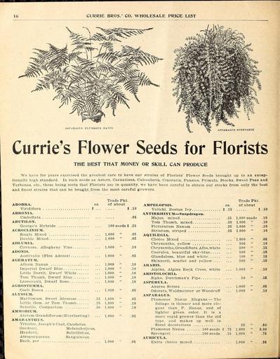 | Keywords: Wholesale price list (16187490830).jpg 16 <br> CURRIE BROS ' CO WHOLESALE PRICE LIST <br> ASPARAGUS PLrMOSUS KAN'US <br> A8PAKAGU8 8PEENBERI <br> Currie's Flower Seeds for Florists <br> THE BEST THAT MONEY OR SKILL CAN PRODUCE <br> We have for years exercised the greatest care to have our strains of Florists' Flower Seeds brought up to an excep- <br> tionally high standard In such seeds as Asters Carnations Calceolaria Cineraria Pansies Primula Stocks Sweet Peas and <br> Verbenas etc these being sorts that Florists use in quantity we have been careful to obtain our stocks from only the best <br> and finest strains that can be bought from the most careful growers <br> ABOBRA oz <br> Viridiflora <br> ABRONIA <br> Umbellata <br> ABUTILON <br> George's Hybrids <br> ACROCMIVIUM <br> Single Mixed <br> Double Mixed <br> ADLTJMIA <br> Cirrhosa Allegheny Vine <br> ADONIS <br> Aestivalis Flos Adonis <br> AGERATUM <br> Album Nanun <br> Imperial Dwarf Blue <br> Little Dorrit Dwarf White <br> Tom Thumb Dwarf Blue <br> Lasseauxii Dwarf Rose <br> AGROSTEMMA <br> Coeli Rosea <br> ALYSSUM <br> Maritimum Sweet Alyssum 15 <br> Little Gem or Tom Thumb 25 <br> Saxatile Compactum 30 <br> AMMOBIUM <br> Alatum Grandiflorum Everlasting <br> AMARANTHUS <br> Tricolor Joseph's Coat Caudatus <br> Gordonii MelanchoHcus <br> Henderii Salicifolius <br> Atropurpureus Sanguineus <br> Each per <br> Trade Pkt <br> of about <br> <br> 10 <br> 05 <br> 100 se <br> eds <br> 25 <br> 1 000 <br> 1 000 <br> <br> 05 <br> 05 <br> 1 000 <br> <br> 10 <br> 1 000 <br> <br> 05 <br> 1 000 <br> 1 000 <br> 1 000 <br> 1 000 <br> 1 000 <br> ˘' <br> 10 <br> 10 <br> 10 <br> 10 <br> 10 <br> 1 000 <br> <br> 05 <br> 1 000 <br> 1 000 <br> 1 000 <br> ˘ ˘ <br> 05 <br> 10 <br> 10 <br> 1 000 <br> 1 000 <br> 05 <br> 05 <br> Trade Pkt <br> AMPEL OPSIS oz of about <br> Veitchi Boston Ivy 15 10 <br> ANTIRRHINUM ” Snapdragon <br> Majus mixed 25 1 000 seeds 10 <br> Tom Thumb mixed 30 1 000 10 <br> Picturatum Nanum 25 1 000 10 <br> Striatum striped 25 1 000 10 <br> AQTJILEGIA <br> Choice Mixed 1 000 05 <br> Chrysantha yellow 500 10 <br> Chrysantha Grandiflora Alba white 500 15 <br> Coerulea beautiful sky-blue 500 15 <br> Glandulosa blue and white 100 15 <br> Skinnerii scarlet and yellow 500 15 <br> ARABIS <br> Alpina Alpine Rock Cress white 1 000 10 <br> ARISTOLOCHIA <br> Sipho Dutchman's Pipe 50 15 <br> ASPERULA <br> Azurea Setosa 1 000 05 <br> Odorata Waldmeister or Woodruff 1 000 10 <br> ASPARAGUS <br> Plumosus Nanus Elegans ” The <br> foliage is thinner and more ele- <br> gant than P Nanus and of <br> lighter green color It is a <br> more rapid grower than the old <br> type and makes up well in <br> floral decorations 25 50 <br> Plumosus Nanus 100 seeds 75 1 000 5 00 <br> Sprengeri 100 seeds 15 1 000 75 <br> AURICULA <br> Extra choice mixed 1 000 26 42212819 133036 66130 Page 16 Text http //www biodiversitylibrary org/page/42212819 1905 10 5962/bhl title 66130 Currie Brothers Company ; Henry G Gilbert Nursery and Seed Trade Catalog Collection NameFound Abobra NameConfirmed Abobra EOLID 5736481 NameBankID 1812999 NameFound Abronia NameConfirmed Abronia EOLID 35792 NameBankID 4935004 NameFound Abutilon NameConfirmed Abutilon hybrid EOLID 71367 NameFound Ageratum NameConfirmed Ageratum L EOLID 59467 NameFound Agrostemma NameConfirmed Agrostemma EOLID 61056 NameBankID 2646534 NameFound Alatum NameConfirmed Alatum NameBankID 5133679 NameFound Alpina NameConfirmed Alpina EOLID 57050 NameBankID 2994443 NameFound Alyssum NameConfirmed Alyssum L EOLID 39058 NameFound Amaranthus NameConfirmed Amaranthus EOLID 37601 NameBankID 2646887 NameFound Ammobium NameConfirmed Ammobium EOLID 6262731 NameBankID 1671531 NameFound Arabis NameConfirmed Arabis EOLID 37457 NameBankID 2648385 NameFound Aristolochia NameConfirmed Aristolochia aff ringens 2283 EOLID 11921687 NameFound Asparagus NameConfirmed Asparagus var pygmaeus Makino EOLID 10487111 NameFound Asperula NameConfirmed Asperula EOLID 11283722 NameBankID 2657134 NameFound Atropurpureus NameFound Auricula NameConfirmed Auricula EOLID 15518830 NameBankID 241260 NameFound Azurea NameConfirmed Azurea NameBankID 2999179 NameFound Calceolaria NameConfirmed Calceolaria EOLID 72303 NameBankID 2665046 NameFound Caudatus NameFound CINERARIA NameConfirmed Cineraria EOLID 6258313 NameBankID 1674869 NameFound CINERARIA NameConfirmed Cineraria EOLID 6258313 NameBankID 4894724 NameFound Cirrhosa NameFound Compactum NameConfirmed Compactum NameBankID 4455517 NameFound Elegans NameConfirmed Elegans NameBankID 5116399 NameFound Flos NameConfirmed Flos EOLID 32842 NameBankID 3001797 NameFound Glandulosa NameConfirmed Glandulosa EOLID 63989 NameBankID 4549918 NameFound Majus NameConfirmed Majus NameBankID 5328037 NameFound Maritimum NameFound Nanum NameConfirmed Nanum NameBankID 5331422 NameFound Nanus NameConfirmed Nanus EOLID 73713 NameBankID 2610066 NameFound Picturatum NameFound Plumosus NameFound Salicifolius NameFound Sanguineus NameFound Setosa NameConfirmed Setosa EOLID 106889 NameBankID 3485568 NameFound Sipho NameConfirmed Sipho EOLID 16239689 NameBankID 4344323 NameFound Striatum NameFound Viridiflora Biodiversity Heritage Library Currie Bros Co Wholesale price list autumn 1905 Garden Stories Bulbs Plants Catalogs Equipment and supplies Flowers Gardening Nurseries Horticulture Plants Ornamental Seeds U S Department of Agriculture National Agricultural Library bhl page 42212819 dc identifier http //biodiversitylibrary org/page/42212819 bhlGardenStories BHLinbloom bulbs plants nurseries horticulture plants ornamental u s department of agriculture national agricultural library bhlgardenstories bhlinbloom Information field Flickr posted date ISOdate 2015-01-26 CC-BY-2 0 BioDivLibrary https //flickr com/photos/61021753 N02/16187490830 2015-08-25 05 52 06 cc-by-2 0 PD-old-70-1923 Wholesale price list Photos uploaded from Flickr by Fæ using a script |