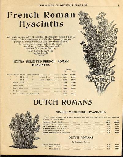| Keywords: Wholesale price list (16374843515).jpg CURRIE BROS ' CO WHOLESALE PRICE LIST <br> French Roman <br> Hyacinths <br> We make a specialty of selected thoroughly cured bulbs of <br> these Our arrangements with the fastest steamers ~ <br> permit us to deliver bulbs that have been allowed <br> to properly ripen as early as those har- <br> vested early before they are well <br> matured and forwarded by <br> slow boats to save the <br> higher freight <br> rates <br> EXTRA SELECTED FRENCH ROMAN <br> HYACINTHS <br> ' Prices <br> I 100 1000 <br> Sing-le White 11 to 12 centimeters 1 85 17 00 <br> 12 to 15 selected 2 60 24 00 <br> ' 13 to 15 extra selected 2 90 27 00 <br> Blush Pink 2 50 23 00 <br> Dark Rose 2 50 23 00 <br> Light Blue 2 50 23 00 <br> Yellow 6 00 <br> White Italian Red Skinned 2 35 22 00 <br> DUTCH ROMANS <br> SINGLE MINIATURE HYACINTHS <br> These come in after the French Romans and are especially desirable for growing <br> in pans for Easter sales <br> 100 1000 <br> Gigantea Light Pink 2 15 20 00 <br> Gertrude Deep Rose 2 00 19 00 <br> l a Grandesse Pure White 2 35 22 00 <br> L' Innocence Pure White 2 25 21 00 <br> Czar Peter Light Blue 2 35 22 00 <br> Grand Maitre Deep Porcelain 2 00 19 00 <br> DUTCH ROMANS <br> In Separate Colors <br> Single Rose mixed 1 40 12 50 <br> White mixed 1 65 16 00 <br> Blue mixed 1 40 12 60 42212832 133036 66130 Page 3 Text http //www biodiversitylibrary org/page/42212832 1905 10 5962/bhl title 66130 Currie Brothers Company ; Henry G Gilbert Nursery and Seed Trade Catalog Collection NameFound Gigantea NameConfirmed Gigantea EOLID 91906 NameBankID 4549793 Biodiversity Heritage Library Currie Bros Co Wholesale price list autumn 1905 Garden Stories Bulbs Plants Catalogs Equipment and supplies Flowers Gardening Nurseries Horticulture Plants Ornamental Seeds U S Department of Agriculture National Agricultural Library bhl page 42212832 dc identifier http //biodiversitylibrary org/page/42212832 bhlGardenStories BHLinbloom bulbs plants nurseries horticulture plants ornamental u s department of agriculture national agricultural library bhlgardenstories bhlinbloom Information field Flickr posted date ISOdate 2015-01-26 CC-BY-2 0 BioDivLibrary https //flickr com/photos/61021753 N02/16374843515 2015-08-25 05 54 21 cc-by-2 0 PD-old-70-1923 Wholesale price list Photos uploaded from Flickr by FĂŚ using a script |