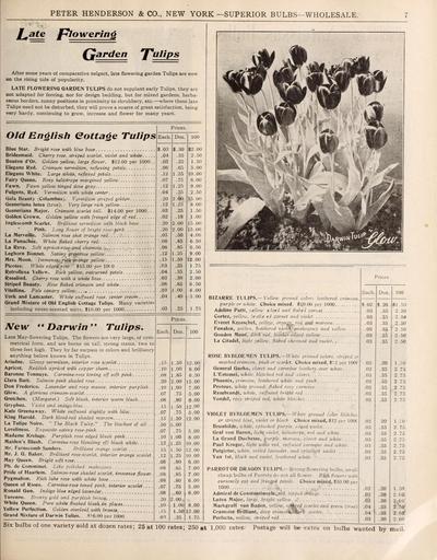 Keywords: Wholesale price list of requisites for florists and market gardeners (16590397679).jpg PETER HENDERSON CO NEW YORK ”SUPERIOR BULBS ” WHOLESALE <br> I ate Flowering <br> garden Tulips <br> After some years of comparative nelgect late flowering garden Tulips are now <br> on the rising tide of popularity <br> LATE FLOWERING GARDEN TULIPS do not supplant early Tulips they are <br> not adapted for forcing nor for design bedding but for mixed gardens herba- <br> ceous borders sunny positions in proximity to shrubbery etc ” where these late <br> Tulips need not be disturbed they will prove a source of great satisfaction being <br> very hardy continuing to grow increase and flower for many years <br> Old English Cottage Tulips <br> Blue Star Bright rose with blue base <br> Bridesmaid Cherry rose striped scarlet violet and white <br> Bouton d'Or Golden yellow large flower 12 00 per 1000 <br> Elegans Red Crimson vermilion reflexing petals <br> Elegans White Large white reflexed petals <br> Fairy Queen Rosy heliotrope margined yellow <br> Fawn Fawn yellow tinged dove gray <br> Fulgens Red Vermilion with white center <br> Gala Beauty Columbus Vermilion striped golden <br> Gesneriana lutea true Very large rich yellow <br> Gesneriana Major Crimson scarlet tall 14 00 per 1000 <br> Golden Crown Golden yellow with fringed edge of red <br> lnglescomb Scarlet Brilliant vermilion with black base <br> Pink Long flower of bright rose-pink <br> La Merveille Salmon rose shot orange red <br> La Panachee White flaked cherry red <br> La Reve Soft apricot-rose and chamois <br> Leghorn Bonnet Satiny prijnrose yellow <br> Mrs Moon Immense Ticfy orange yellow <br> Picoteel White edged rose 1 5 00 per 10 0 <br> Retroflexa Yellow Rich yellow outcurved petals <br> Rosalind Cherry rose with a white base <br> Striped Beauty Rose flaked crimson and white <br> Vitellina Pale canary yellow » <br> York and Lancaster White suffused rose center cream <br> Grand Mixture of Old English Cottage Tulips Many varieties <br> including sweet-scented sorts 16 00 per 1000 <br> New Darwin Tulips <br> Late May-flowering Tulips The flowers are very large of sym- <br> metrical form and are borne on tall strong stems two to <br> three feet high They by far surpass in colors and brilliancy <br> anything before known in Tulips <br> Ariadne Glossy vermilion interior rose scarlet <br> Apricot Reddish apricot with copper sheen <br> Baronne Tonnaye Carmine-rose toning off soft pink <br> Clara Butt Salmon-pink shaded rose <br> Don Frederico Lavender and rosy mauve interior purplish <br> Glow A glorious crimson-scarlet <br> Gretchen Margaret Soft blush interior warm blush <br> Gryphus Violet and indigo-blue <br> Kate Greenaway White suffused slightly with lilac <br> King Harold Dark blood-red shaded maroon <br> La Tulipe Noire The Black Tulip The blackest of all <br> Loveliness Exquisite satiny rose-pink <br> Madame Krelage Purplish rose edged blush pink <br> Maiden's Blush Carmine-rose blending off blush white <br> Mr Farnscomb Sanders Brilliant orange scarlet <br> Mr J G Baker Brilliant rose-scarlet interior orange scarlet <br> May Queen Bright soft rose <br> Ph de Comminet Like polished mahogany <br> Pride of Haarlem Salmon-rose shaded scarlet immense flower <br> Pygmalion Rich lake rose with white base <br> Queen of Roses Carmine-rose toned pink interior scarlet <br> Ronald Gun Indigo blue edged lavender <br> Turenne Bronzy gold and purplish brouua <br> White Queen Pure white flushed blush in places <br> Yellow Perfection Golden overlaid with bronze <br> Grand Mixture of Darwin Tulips « 16 00 per 1000 <br> Prices <br> Each <br> Doz <br> 100 <br> 03 <br> 30 <br> 2 00 <br> 04 <br> 35 <br> 2 50 <br> 03 <br> 25 <br> 1 50 <br> 06 <br> 65 <br> 5 00 <br> 12 <br> 1 25 <br> 10 00 <br> 07 <br> 75 <br> 6 00 <br> 12 <br> 1 25 <br> 9 00 <br> 04 <br> 35 <br> 2 50 <br> 20 <br> 2 00 <br> 15 00 <br> 12 <br> 1 25' <br> 8 00 <br> 03 <br> 25 <br> 1 50 <br> 02 <br> 18 <br> 1 00 <br> 20 <br> 2 00 <br> 15 00 <br> 20 <br> 2 00 <br> 15 00 <br> 05 <br> 50 <br> 4 00 <br> 08 <br> 85 <br> 6 50 <br> 08 <br> 85 <br> 6 50 <br> 12 <br> 1 25 <br> 9 00 <br> 15 <br> 1 50 <br> 12 00 <br> 03 <br> 25 <br> 1 75 <br> 04 <br> 35 <br> 2 50 <br> 03 <br> 30 <br> 2 00 <br> 08 <br> 85 <br> 6 50 <br> 10 <br> 1 00 <br> 8 00 <br> 04 <br> 40 <br> 3 00 <br> 03 <br> 25 <br> 1 75 <br> Prices <br> Each <br> 15 <br> 10 <br> 08 <br> 20 <br> 10 <br> 07 <br> 08 <br> 15 <br> 07 <br> 15 <br> 50 <br> 07 <br> 10 <br> ˘I 2 <br> 15 <br> 12 <br> 08 <br> ˘ 08 <br> 08 <br> 08 <br> 07 <br> 08 <br> 20 <br> 10 <br> 15 <br> 0T <br> Doz <br> 1 50 <br> 1 00 <br> 1 85 <br> 2 00 <br> 1 00 <br> 75 <br> 80 <br> 50 <br> 75 <br> 1 50 <br> 5 00 <br> 75 <br> 1 00 <br> 1 25 <br> 1 50 <br> 25 <br> 80 <br> 85 <br> 85 <br> 80 <br> 75 <br> 80 <br> 2 00 <br> 1 00 <br> 1 50 <br> 25 <br> 100 <br> 12 00 <br> 8 00 <br> 6 50 <br> 15 00 <br> 7 00 <br> 5 00 <br> 8 00 <br> 12 00 <br> 5 00 <br> 12 00 <br> 5 00 <br> 8 00 <br> 10 00 <br> 12 00 <br> 10 00 <br> 6 00 <br> 7 00 <br> 7 00 <br> 6 00 <br> 5 00 <br> 6 00 <br> 8 00 <br> 12 00 <br> 1 75 <br> BIZARRE TULIPS ” Yellow ground colors feathered crimson <br> purple or white Choice mixed 10 00 per 1000 <br> Adeline Patti yellow elgei and flaked garget <br> Cortez yellow feilhe ei garnet and violet <br> Everet Krpsschel yellow orangt red anfl maroon <br> Fenalon golden feathered violcl mahogany and yellow <br> Gouden Munf dark' red feather edged yellow <br> La Citadel light yellow flaked chestnut and violet <br> ROSE BYBLOEMEN TULIPS ” White ground colors striped oi <br> marked crimson pink or scarlet Choice mixed 12 per lOOf <br> General Gurko claret and carmine feathers over white <br> L'Estemei white blotched red and claret <br> Phoenix crimson feathered while and pink <br> Proteus white ground flaked rosy carmine <br> Rembrandt white suffused bright red <br> Vondel rosy striped red white blotches <br> VIOLET BYBLOEMEN TULIPSi ” White ground cotit bl -t he <br> or str