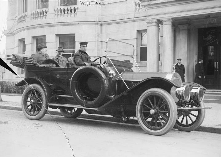 | Keywords: WHTaftMotorcar.jpg U S President William Howard Taft seated in back right of the car; at left of photo in his Pierce-Arrow touring car Unidentified man seated next to President Taft The driver is not identified but is likely Taft's official driver George Robinson Bain News Service photograph cracked glass negative via Library of Congress website http //hdl loc gov/loc pnp/ggbain 12970; converted from TIFF to jpg and border cropped before upload ca 1910 Unnamed photographer in employ of Bain News Service PD-Bain 1909 automobiles Presidential automobiles of the United States 1910 Pierce-Arrow automobiles 1909 William Howard Taft Sitting_men |