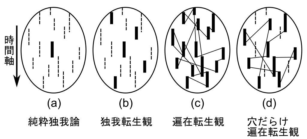 | Keywords: Why am i me 4.svg Classification of possible positions about question Why am I myself rather than someone else or Why am I here and now by Tsuneo Watanabe pschologist philosopher professor at Toho University Japan The arrow at left indicates direction of time Past top to Future down a Pure solipsism b Solipsistic reincarnationism c Universal reincarnationism d Universal reincarnationism full of holes Tsuneo Watanabe himself pushes position c because of he thinks that is most elegant Tsuneo Watanabe's literature 1996 p 175 ISBN 978-4061493032 2012-05-02 own Inkscape Philosophy of mind Reincarnation Diagrams in Japanese |