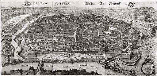 | Keywords: Wien 1609 1640 ArM.jpg Fortified Vienna around 1609/1640 Wiens befästningsanläggningar Det befæstede Wien i årene 1609-1640 <hr> Vienne vue du ciel depuis le Nord Copie à l'identique datant de 1640 d'une première gravure de 1609 <p> Gravure sur plaque de cuivre à l'eau-forte composée de 3 x 2 feuilles Taille originale 795 x 1595 mm <p> Titre VIENNA AVSTRIAE Vienne en Autriche Le texte est accompagné des armoiries du duché à gauche et de celles de la ville de Vienne à droite Une minuscule légende en bas à droite indique Vißcher excudit I Houfnagel fecit Le logo tout en bas à droite est une dédicace à l'Empereur Ferdinand III <p> Caractéristiques de la gravure <br /> Il s'agit de l'une des plus anciennes vues du ciel d'une ville par opposition aux précédentes vues de profil la gravure fournit un aperçu très détaillé de la ville et du paysage environnant on y voit la ville dans son apparence encore médiévale avant que le style baroque ne s'y impose on peut également observer les fortifications dont la construction est presque achevée en prévision des attaques ottomanes le vieux mur faisant face au Danube au centre de l'image n'a pas encore été reconstruit <hr> Bird's-eye view of Vienna from North Second unmodified edition of 1640 based on the first edition of 1609 <p> Copperplate print and etching composed of 3 x 2 sheets Original size 795 x 1595 mm <p> Title VIENNA AVSTRIAE Wienn In Oesterreich The text is flanked by the coat of arms of the dukedom left and the city Vienna right The fine print at the bottom-right reads Vißcher excudit I Houfnagel fecit The logo at far bottom-right contains a dedication to Kaiser Ferdinand III <p> Characteristic features <br /> One of earliest bird's-eye views of a city as opposed to the previously dominating profile views Detailed display of the city and its sourrounding landscape Shows the then still medieval appearance of the city before the paradigm shift to baroque style Shows the nearly finished fortification of the city intended as a defense against the Osman Empire The part of the old city wall facing the danube side isn't yet strengthened / rebuilt <hr> Vogelschau auf Wien von Norden Zweite unveränderte Ausgabe von 1640 basierend auf der ersten Ausgabe von 1609 <p> Kupferstich und Radierung zusammengesetzt aus 3 x 2 Blättern Originalgröße 795 x 1595 mm <p> Titel VIENNA AVSTRIAE Wienn In Oesterreich Links des Titels steht das erzherzogliche Wappen rechts davon jenes der Stadt Wien Das Kleingeschriebene im rechten Drittel ganz unten lautet Vißcher excudit I Houfnagel fecit Der rechts unten in eine Kartusche eingefasste Text ist eine Widmung an Kaiser Ferdinand III <p> Charakterische Mermale <br /> Eine der ersten Vogelschauen auf eine Stadt im Gegensatz zu den davor üblichen Profildarstellungen Miniaturhafte detaillierte Wiedergabe des Stadtkörpers und seiner Umgebung Zeigt das noch hauptsächlich mittelalterliche Erscheinungsbild bevor der Barock Einzug hielt Zeigt die bereits bereits größtenteils fertiggestellte Umwallung und Befestigung der Stadt die zum Schutz der Stadt vor dem Osmanischen Reich dienen sollte Nur an der Donauseite ist auf dem Bild noch die alte Stadtmauer vorhanden zu beiden Seiten des Rotenturmtores Graphische Sammlung Albertina Hrsg Oesterreich in alten Ansichten - Veduten aus der Zeit von 1490 bis 1850 Residenz Verlag Salzburg 1977 Tafel 3<p> Original Historisches Museum der Stadt Wien Inv Nr 31043 Jacob Hoefnagel 1609 / Claes Jansz Visscher 1640 <br> uploaded by Contributor reworked by ArtMechanic 1609 / 1640 Image Vienna austriae detail jpg Notes This reproduction is not a scan but a photo Its quality is therefore suboptimal It is intended to be replaced by a better version in the future Diese Reproduktion ist kein Scan sondern ein Foto Ihre Qualität lässt deshalb zu wünschen übrig Sie soll später durch eine bessere Version ersetzt werden PD-old Bilderwerkstatt 48 14 42 7 N 16 24 15 4 E heading SW Views of Vienna City walls of Vienna Historical images of Vienna Library of the University of Vienna Jacob Hoefnagel Vienna in the 17th century |