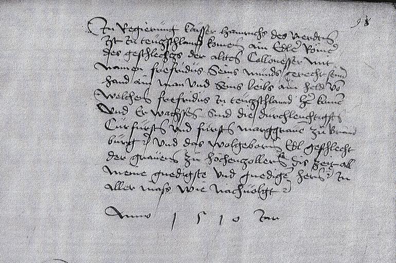 Keywords: Wien 2799 98r oben.jpg Beginn einer kurzen Abhandlung über den Ursprung der Hohenzollern 1510 ÖNB Wien Cod 2799 Bl 98r 1510 Georg Rüxner Autograph siehe http //archiv twoday net/stories/6476722/ PD-old-100 Georg Rüxner