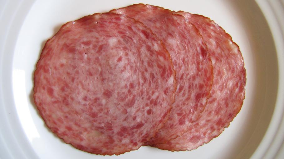 Keywords: Wiener Wurst slices.jpg en Three slices Wiener Wurst Sold under the name Tiroler-Salami Wiener Wurst Vermarktet unter dem Namen Tiroler-Salami own LordOider 2014-04-17 Sausages of Austria Cc-zero