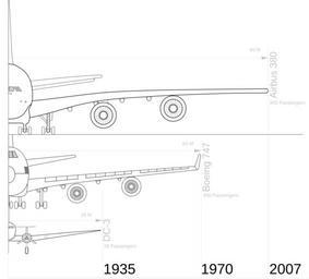 | Keywords: Wignspan Diagram.svg en This is a comparison diagram showing major airliners and their increased size over time The passenger capacity numbers are a maximum number The airlines often carry far fewer passengers due to allowing more space for business and first class customers The Data for wingspan and year for the 747 and Airbus 380 are taken from the manufacturer websites The DC-3 is referencing information provided on Wikipedia Daniel Jackson Kidd 2008-10-13 Line drawings of aircraft Aircraft comparison diagrams |