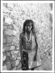 Photograph of Wiki, Chief antelope priest, wearing full dress of jewelry and wampum, at the pueblo of Walpi, Arizona, ca.1898. He wears a kilt and many necklaces. His arms, chest and face are decorated with white paint or dried mud. He stands to the right of a wall of rocks.