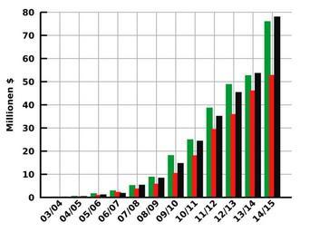 | Keywords: Wikimedia Foundation financial development.svg de basiert auf File Wikimedia Foundation financial development 2003-2012 png Daten von dort 2014-10-08 20 44 22 own StefanPohl other versions thumb English version v gnuplot 5 1 CVS reset set term svg size 640 480 fname 'Verdana bold' fsize 18 lw 3 unset key set border 3 set grid lt 1 lc rgb 0xAAAAAA lw 5 set format y ' 0f' set tics nomirror set xtics rotate by 45 right scale 0 set ylabel 'Millionen ' set style histogram gap 1 set style fill solid set output 'wp_finance svg' plot forii in '2 3 5' 'wp_finance txt' u column ii+0 /1e6 xtic 1 w histogram lc rgb word '0x000000 0x009933 0xFF1515 0x000000 0x0C0C0C' ii+0 unset output cc-zero Uploaded with UploadWizard Wikimedia statistics Files by Kopiersperre Wikimedia fundraising analysis |