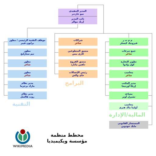 | Keywords: Wikimedia Foundation organization chart ar.svg An organization chart for the Wikimedia Foundation as of 11 January 2008 Lighter frames indicate employees in St Petersburg who will not relocate to San Francisco Editable SVG format created by User Guillom from a public domain PDF uploaded by user Eloquence both originally on the Wikimedia Foundation wiki Translated by user alnokta 2008-01-11 Users Eloquence and Guillom image Wikimedia_Foundation_organization_chart svg foundation Wikimedia Foundation wiki Eloquence Wikimedia Foundation organizational charts |