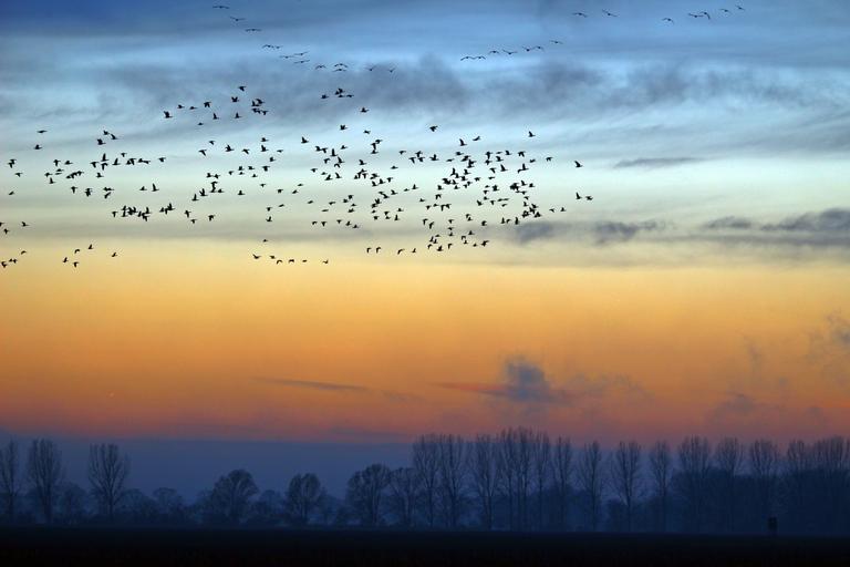 Keywords: wild geese evening sky nature field geese migratory birds landscape arable sky sunset