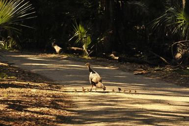 Keywords: wild turkeys hen chicks road rural outdoors birds cumberland island national seashore georgia usa wildlife trees forest