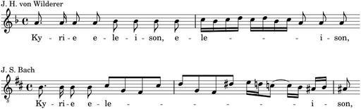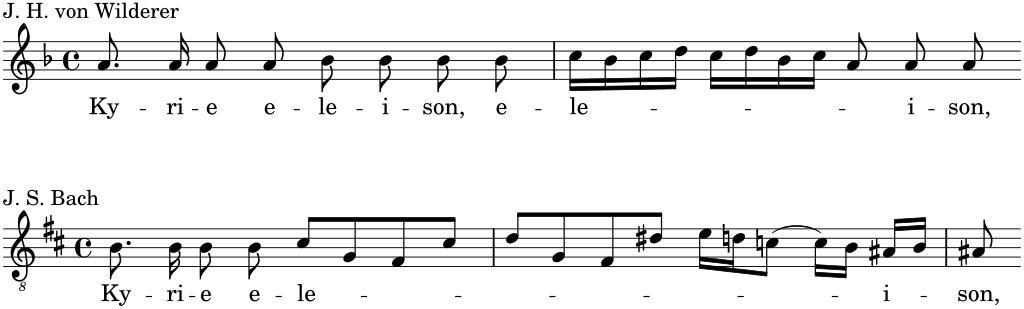 | Keywords: Wilderer Bach BWV 232.svg de J S Bach h-Moll-Messe BWV 232 Kyrie Nr 1 Vergleich mit J H Wilderer own Wikiwal 2013-01-25 PD-old-auto-1923 1750 Lilipond source text <pre> \version 2 14 2 \header tagline f \paper indent 0\mm ragged-right f J H von Wilderer \score \new Staff \relative c' \autoBeamOff \key f \major \time 4/4 a'8 a16 a8 a bes bes bes bes c16 bes c d c d bes c a8 a a \addlyrics Ky -- ri -- e e -- le -- i -- son e -- le -- _ _ i -- son \header piece J H von Wilderer \markup \vspace 2 J S Bach \score \new Staff \relative c' \set Score currentBarNumber 30 \key d \major \clef G_8 \time 4/4 \autoBeamOff b8 b16 b8 b cis g fis cis' d g fis dis' e16 d c8 c16 b ais b ais8 \addlyrics Ky -- ri -- e e -- le -- _ _ i -- son \header piece J S Bach </pre> Mass in B minor Kyrie |