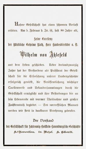 Keywords: Wilhelm von Ahlefeldt (1818-1897) 03.jpg de Todesanzeige für Carl Wilhelm von Ahlefeld t 1818-1897 Herr auf Treuholz und Wirklicher Geheimer Rat Landesdirektor Mitglied der Regierung in Plön und Klosterprobst von Uetersen own reproduktion original photo is more than 100 years old Umbekannt 1897 PD-old Wilhelm von Ahlefeldt 1818 “1897 Death notice |
