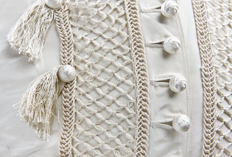 | Keywords: Wilhelmina von Hallwyls bröllopsklänning. Detalj. Bröstet vänster sida - Hallwylska museet - 87238.tif BRUDDRÄKT jämte sexton lösa föremål Bestående av klänning slöja krona krans och bukett näsduk strumpor strumpeband skor linne snörliv kalsonger nattröja nattmössa morgonmössa och tofflor Klänning Liv och kjol samt fyra lösa bandlängder till rosett Av vit sidenmoiré moiré antique med handknuten garnering av gulvitt silke Hand- och maskinsydd Liv Högt bestående av två framstycken två sidostycken och ett ryggstycke alla sneddade Knäppning framtill med kulformiga vita snörmakeriknappar samt knapphål nedanför dessa hakar och hyskor av vit metall isydda med kaststygn under en kantslå av vitt siden Ärmar halvlånga nedre kanten rak Liv och ärmar fodrade med vitt glansigt bomullstyg s k kambrik I sömmarna stöd av valfiskben Kjol Bestående av åtta raka våder baktill ett fållat sprund samt i högra framsömmen en avlång ficka av tyg som livfodret sömmarna maskinsydda Mått Liv längd omkring 41 cm ; bröstvidd omkring 50 cm ; halsvidd omkring 37 cm ; midjevidd omkring 54 cm Ärmar längd omkring 54 cm ; vidd omkring 32 cm Holkar längd omkring 18 cm ; vidd omkring 26 cm Bårder bredd omkring 4 6 5 och 7 cm Tofs längd omkring 5 5 cm Frans längd omkring 3 5 och 8 cm Kjol längd fram omkring 1 16 m ; bak omkring 1 77 m ; vidd omkring 5 48 m Linning längd omkring 64 cm ; bredd omkring 3 cm <br/><br/>Bandlängder <br/>Av vit sidenrips med satinkanter de två korta till öglor de två långa till ändar de senare på vardera ytterändan med garnering som på livet <br/><br/>Mått <br/>Längd 0 41 och 1 36 m ; bredd 18 cm<br/><br/>Anm <br/>Rosetten troligen från en senare modellförändring <br/><br/>Slöja <br/>Av vit silkestyll Rektangulär i två olika stora stycken <br/><br/>Mått <br/>Stora stycket längd omkring 2 32 m ; bredd omkring 1 65 m <br/>Lilla stycket längd omkring 1 68 m ; bredd omkring 1 56 m<br/><br/>Krona <br/>Rund Stommen bestående av åtta radiella byglar av mörk karkas nedtill fästa vid en horisontell liggande ring byglarnas övre ändar sammanlöpande upptill i mitten till en nedåtvänd kort spets samt virade med tätt sittande myrtenkvistar <br/><br/>Krans <br/>Med stomme som kronan samt omvirad med myrtenkvistar <br/><br/>Bukett <br/>Av myrten med rester av vita liljor <br/>Dessutom fragment av en liten bukett bestående av en ros samt gullborste Linosyris vulgaris eller Aster linosyris; användes på 1800-talet och ännu i början av 1900- talet som grönt i buketter o d <br/><br/>Näsduk <br/>Av vit linnebatist med bred vit spets application de Bruxelles <br/>Kvadratisk handsydd <br/>Spetsen knypplad samt sydd på maskinvävd tyll <br/>Spetsen fastsydd med efterstygn av vit tvåtrådig linnetråd vid ett mittstycke av vit linnebatist <br/><br/>Mått <br/>Sidlängd omkring 43 cm <br/><br/>Strumpor ett par <br/>Av vitt silke vävda <br/>På vardera smalbenets utsida en tät rand upptill med axliknande avslutning samt nedtill tvådelad med en lång rand på foten och en kortare på hälen <br/>Upptill en bred fåll på utsidan med två par parallella smala ljusröda ränder <br/><br/>Mått <br/>Längd omkring 79 cm ; vidd omkring 22 5 cm <br/><br/>Strumpeband ett par <br/>Handsydda Av ljust rödgredelint sidentaftband varpå pålagt ett mittparti av vitt sidentaftband med stadkanterna omvikta och fastsydda med fållstygn av ljust rödgredelint silke <br/>Bandens ändar trubbvinkligt urklippta <br/><br/>Mått <br/>Längd omkring 1 m ; mittparti längd 25 cm <br/>Band bredd omkring 2 5 cm <br/><br/>Skor sedermera s k pumps ett par <br/>Av vit sidenatlas <br/>Hand- och vändsydda <br/>På vardera sidan på mitten två snett tvärgående efterstygnssömmar s k sidosömmar av vitt silke <br/>Knytband av vita smala tvåskaftade sidentaftband <br/>Bakstycket fodrat med vitt getskinn framstycket med vitt tvåskaftat linnetyg <br/>Sula av tunt ljusbrunt läder med tvärskuren tå Fodersula av vitt getskinn <br/>Klack av trä halvhög svagt insvängd klädd med vit sidenatlas samt med ytterlapp av ljusbrunt läder fäst med sex stift av mässing <br/><br/>Mått <br/>Längd omkring 24 cm ; bredd omkring 6 2 cm<br/>Klack höjd omkring 3 cm <br/>Knytband längd omkring 52 cm ; bredd 0 8 cm <br/><br/>Linne <br/>Av vitt tvåskaftat linnetyg samt med broderier <br/>Hand- och maskinsytt <br/>Fram- och bakstycke sneddade samt hopsydda med fällsömmar <br/>Ärmhålen starkt sneddade uppåt ärmarna korta med kilar <br/>Halsurringningen svagt rundad samt tätt rynkad <br/>Alla sömmar sydda med fin vit bomullstråd <br/><br/>Mått <br/>Längd omkring 1 07 m ; vidd nedtill 1 8 m <br/>Ärmar längd omkring 7 8 cm ; vidd omkring 36 cm <br/>Halslinning längd omkring 93 cm ; bredd omkring 0 8 cm <br/><br/>Snörliv <br/>Av vitt fyrskaftat bomullstyg och vitt tvåskaftat linnetyg <br/>Handsytt <br/>Två symmetriska sneddade stycken hopsydda framtill i mitten och bildande en lång spets Nedtill på vardera sidan om denna fyra kilar en tresidig och tre fyrsidiga upptill två starkt sneddade tresidiga kilar Mellan kilarna ett stöd av valfiskben utanför bortre kilen sex dylika stöd <br/>Sömmarna sydda dels med vitt silke dels med vit bomullstråd <br/><br/>Mått <br/>Höjd fram omkring 35 5 cm ; bak omkring 35 cm <br/>Midjevidd omkring 46 cm <br/><br/>Kalsonger s k öppna ett par <br/>Av vitt smalrandigt fyrskaftat bomullstyg samt med broderi <br/>Handsydda och handbroderade <br/>Bestående av två fram- och baktill sneddade stycken på framsidan hopsydda ett stycke upptill med fällsöm <br/>Alla sömmar sydda med vit fin bomullstråd <br/>Mått <br/>Längd omkring 84 cm ; linning längd omkring 94 cm <br/>Ben vidd nedtill omkring 56 cm ; band längd omkring 83 cm <br/><br/>Underkjol <br/>Av vitt tvåskaftat bomullstyg samt med broderi <br/>Hand- och maskinsydd <br/>Bestående av fem raka våder upptill tätt rynkad runtomkring samt fastsydd 