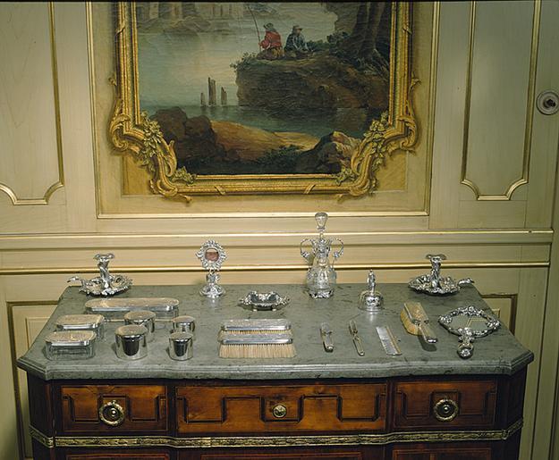 | Keywords: Wilhelmina von Hallwyls toilettsilver på byrå i sängkammaren - Hallwylska museet - 13557.tif Bestående av två ljusstakar 1863; hårborste kam kamask av glas med silverlock klädesborste nålfat ringklocka två avlånga toalettaskar av glas med silverlock samt två runda större toalettaskar 1864; två glasflaskor med fot och handtag av silver endast en i bild klockställ nackspegel nagelborste sammetsborste tandborste och två runda mindre toalettaskar 1865 Graverade och pressade ornament i nyrokoko och naturalistisk stil inskrift Wilhelmina under tysk grevlig krona på sjutton föremål - - Consisting of two candlesticks 1863; hair brush comb silver-lidded glass comb box clothes brush pin tray bell two oblong silver-lidded glass toilet boxes and two larger round toilet boxes 1864; two glass bottles with silver bases and handles only one in the picture a watchstand neck mirror nail brush velvet brush toothbrush and two smaller round toilet boxes 1865 Engraved and pressed-work neo-Rococo and naturalistic ornamentation inscription Wilhelmina under a German countly crown on seventeen items Presented to Wilhelmina Kempe by Walther von Hallwyl before their wedding in 1865 original caption Wilhelmina von Hallwyls toilettsilver på byrå i sängkammaren - 1863 1865 HWY Anna Fridrica Wilhelmina von Hallwyl f Kempe Under ytan om det onämnbara vid sekelskiftet 1900 2013 Hallwylska museet place of origin Stockholm SE original filename hm_t08338 16153 inventory number HWY X II D a 01 13557 CC-BY-SA Toilet services Media contributed by LSH unmatched creator Media contributed by LSH 2013-10 |