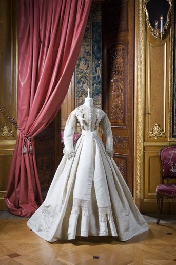 | Keywords: Wilhelminas bröllopsklänning. I en dörröppning - Hallwylska museet - 87246.tif BRUDDRÄKT jämte sexton lösa föremål Bestående av klänning slöja krona krans och bukett näsduk strumpor strumpeband skor linne snörliv kalsonger nattröja nattmössa morgonmössa och tofflor Klänning Liv och kjol samt fyra lösa bandlängder till rosett Av vit sidenmoiré moiré antique med handknuten garnering av gulvitt silke Hand- och maskinsydd Liv Högt bestående av två framstycken två sidostycken och ett ryggstycke alla sneddade Knäppning framtill med kulformiga vita snörmakeriknappar samt knapphål nedanför dessa hakar och hyskor av vit metall isydda med kaststygn under en kantslå av vitt siden Ärmar halvlånga nedre kanten rak Liv och ärmar fodrade med vitt glansigt bomullstyg s k kambrik I sömmarna stöd av valfiskben Kjol Bestående av åtta raka våder baktill ett fållat sprund samt i högra framsömmen en avlång ficka av tyg som livfodret sömmarna maskinsydda Mått Liv längd omkring 41 cm ; bröstvidd omkring 50 cm ; halsvidd omkring 37 cm ; midjevidd omkring 54 cm Ärmar längd omkring 54 cm ; vidd omkring 32 cm Holkar längd omkring 18 cm ; vidd omkring 26 cm Bårder bredd omkring 4 6 5 och 7 cm Tofs längd omkring 5 5 cm Frans längd omkring 3 5 och 8 cm Kjol längd fram omkring 1 16 m ; bak omkring 1 77 m ; vidd omkring 5 48 m Linning längd omkring 64 cm ; bredd omkring 3 cm <br/><br/>Bandlängder <br/>Av vit sidenrips med satinkanter de två korta till öglor de två långa till ändar de senare på vardera ytterändan med garnering som på livet <br/><br/>Mått <br/>Längd 0 41 och 1 36 m ; bredd 18 cm<br/><br/>Anm <br/>Rosetten troligen från en senare modellförändring <br/><br/>Slöja <br/>Av vit silkestyll Rektangulär i två olika stora stycken <br/><br/>Mått <br/>Stora stycket längd omkring 2 32 m ; bredd omkring 1 65 m <br/>Lilla stycket längd omkring 1 68 m ; bredd omkring 1 56 m<br/><br/>Krona <br/>Rund Stommen bestående av åtta radiella byglar av mörk karkas nedtill fästa vid en horisontell liggande ring byglarnas övre ändar sammanlöpande upptill i mitten till en nedåtvänd kort spets samt virade med tätt sittande myrtenkvistar <br/><br/>Krans <br/>Med stomme som kronan samt omvirad med myrtenkvistar <br/><br/>Bukett <br/>Av myrten med rester av vita liljor <br/>Dessutom fragment av en liten bukett bestående av en ros samt gullborste Linosyris vulgaris eller Aster linosyris; användes på 1800-talet och ännu i början av 1900- talet som grönt i buketter o d <br/><br/>Näsduk <br/>Av vit linnebatist med bred vit spets application de Bruxelles <br/>Kvadratisk handsydd <br/>Spetsen knypplad samt sydd på maskinvävd tyll <br/>Spetsen fastsydd med efterstygn av vit tvåtrådig linnetråd vid ett mittstycke av vit linnebatist <br/><br/>Mått <br/>Sidlängd omkring 43 cm <br/><br/>Strumpor ett par <br/>Av vitt silke vävda <br/>På vardera smalbenets utsida en tät rand upptill med axliknande avslutning samt nedtill tvådelad med en lång rand på foten och en kortare på hälen <br/>Upptill en bred fåll på utsidan med två par parallella smala ljusröda ränder <br/><br/>Mått <br/>Längd omkring 79 cm ; vidd omkring 22 5 cm <br/><br/>Strumpeband ett par <br/>Handsydda Av ljust rödgredelint sidentaftband varpå pålagt ett mittparti av vitt sidentaftband med stadkanterna omvikta och fastsydda med fållstygn av ljust rödgredelint silke <br/>Bandens ändar trubbvinkligt urklippta <br/><br/>Mått <br/>Längd omkring 1 m ; mittparti längd 25 cm <br/>Band bredd omkring 2 5 cm <br/><br/>Skor sedermera s k pumps ett par <br/>Av vit sidenatlas <br/>Hand- och vändsydda <br/>På vardera sidan på mitten två snett tvärgående efterstygnssömmar s k sidosömmar av vitt silke <br/>Knytband av vita smala tvåskaftade sidentaftband <br/>Bakstycket fodrat med vitt getskinn framstycket med vitt tvåskaftat linnetyg <br/>Sula av tunt ljusbrunt läder med tvärskuren tå Fodersula av vitt getskinn <br/>Klack av trä halvhög svagt insvängd klädd med vit sidenatlas samt med ytterlapp av ljusbrunt läder fäst med sex stift av mässing <br/><br/>Mått <br/>Längd omkring 24 cm ; bredd omkring 6 2 cm<br/>Klack höjd omkring 3 cm <br/>Knytband längd omkring 52 cm ; bredd 0 8 cm <br/><br/>Linne <br/>Av vitt tvåskaftat linnetyg samt med broderier <br/>Hand- och maskinsytt <br/>Fram- och bakstycke sneddade samt hopsydda med fällsömmar <br/>Ärmhålen starkt sneddade uppåt ärmarna korta med kilar <br/>Halsurringningen svagt rundad samt tätt rynkad <br/>Alla sömmar sydda med fin vit bomullstråd <br/><br/>Mått <br/>Längd omkring 1 07 m ; vidd nedtill 1 8 m <br/>Ärmar längd omkring 7 8 cm ; vidd omkring 36 cm <br/>Halslinning längd omkring 93 cm ; bredd omkring 0 8 cm <br/><br/>Snörliv <br/>Av vitt fyrskaftat bomullstyg och vitt tvåskaftat linnetyg <br/>Handsytt <br/>Två symmetriska sneddade stycken hopsydda framtill i mitten och bildande en lång spets Nedtill på vardera sidan om denna fyra kilar en tresidig och tre fyrsidiga upptill två starkt sneddade tresidiga kilar Mellan kilarna ett stöd av valfiskben utanför bortre kilen sex dylika stöd <br/>Sömmarna sydda dels med vitt silke dels med vit bomullstråd <br/><br/>Mått <br/>Höjd fram omkring 35 5 cm ; bak omkring 35 cm <br/>Midjevidd omkring 46 cm <br/><br/>Kalsonger s k öppna ett par <br/>Av vitt smalrandigt fyrskaftat bomullstyg samt med broderi <br/>Handsydda och handbroderade <br/>Bestående av två fram- och baktill sneddade stycken på framsidan hopsydda ett stycke upptill med fällsöm <br/>Alla sömmar sydda med vit fin bomullstråd <br/>Mått <br/>Längd omkring 84 cm ; linning längd omkring 94 cm <br/>Ben vidd nedtill omkring 56 cm ; band längd omkring 83 cm <br/><br/>Underkjol <br/>Av vitt tvåskaftat bomullstyg samt med broderi <br/>Hand- och maskinsydd <br/>Bestående av fem raka våder upptill tätt rynkad runtomkring samt fastsydd med fållstygn vid en sn