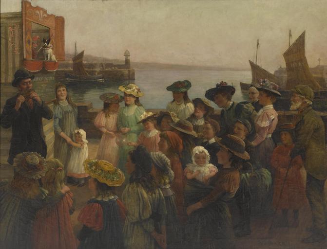 Keywords: William Barr Punch and Judy show.jpg Punch and Judy show; signed 'W Barr ' lower right ; oil on canvas 36 x 47 1/4in http //www bonhams com by 1933 William Barr 1867-1933 PD-old-70 William Barr painter Theatre in art Punch and Judy Images from Bonhams Theatre audience Children in art |