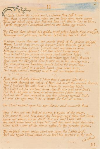 | Keywords: William Blake - The Book of Thel, Plate 5, "II. , O little Cloud . . . ." - Google Art Project.jpg print brown pen ink paper cream Relief etching printed in brown with pen and ink on moderately thick slightly textured cream wove paper print brown pen ink watercolor paper cream Relief etching printed in brown with pen and ink and watercolor on moderately thick slightly textured cream wove paper London 1757 London 1827 William male 2369124 Blake British 1757 - 1827 /collection/yale-center-for-british-art/artwork/the-book-of-thel-plate-5-ii-o-little-cloud-william-blake/2354708/ William Blake Artist /artist/william-blake/4130035/ 4130035 /collection/yale-center-for-british-art/ Yale Center for British Art 2305845 http //britishart yale edu/ 2/23/2012 9 34 13 PM /collection/yale-center-for-british-art/artwork/the-book-of-thel-plate-5-ii-o-little-cloud-william-blake/2354708/ 1789 1789 text flowers vines historical subject Relief etching printed in brown with pen and ink and watercolor on moderately thick slightly textured cream wove paper 152 2354708 False 1789 3/24/2012 1 34 38 PM YCBA/lido-TMS-2257 http //collections britishart yale edu/vufind/Record/1667251 Yale Center for British Art Paul Mellon Collection print 1780 1790 London Creation w108 x h152 cm 1789 False 0 66796875 Item the-book-of-thel-plate-5-ii-o-little-cloud-william-blake The Book of Thel Plate 5 II / O little Cloud b 108 No inscription Inscription _Signed_and_Dated Not signed not dated Not on View Relief etching printed in brown with pen and ink and watercolor on moderately thick slightly textured cream wove paper text flowers vines historical subject special url_id zAEC6dZ5He6VcA PD-old-100-1923 1827 The Book of Thel Google Art Project works by William Blake |