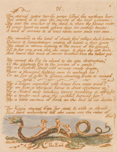 | Keywords: William Blake - The Book of Thel, Plate 8, "IV. , The eternal gates . . . ." - Google Art Project.jpg print brown pen ink paper cream Relief etching printed in brown with pen and ink on moderately thick slightly textured cream wove paper print brown pen ink watercolor paper cream Relief etching printed in brown with pen and ink and watercolor on moderately thick slightly textured cream wove paper London 1757 London 1827 William male 2369124 Blake British 1757 - 1827 /collection/yale-center-for-british-art/artwork/the-book-of-thel-plate-8-iv-the-eternal-gates-william-blake/2371093/ William Blake Artist /artist/william-blake/4130035/ 4130035 /collection/yale-center-for-british-art/ Yale Center for British Art 2305845 http //britishart yale edu/ 2/23/2012 9 34 20 PM /collection/yale-center-for-british-art/artwork/the-book-of-thel-plate-8-iv-the-eternal-gates-william-blake/2371093/ 1789 1789 creature leaf serpent snake reins children riding reins text grass vines nudes historical subject Relief etching printed in brown with pen and ink and watercolor on moderately thick slightly textured cream wove paper 140 2371093 False 1789 3/25/2012 9 06 15 PM YCBA/lido-TMS-2260 http //collections britishart yale edu/vufind/Record/1667255 Yale Center for British Art Paul Mellon Collection print 1780 1790 Felpham Creation w108 x h140 cm 1789 False 0 7734375 Volume the-book-of-thel-plate-8-iv-the-eternal-gates-william-blake The Book of Thel Plate 8 IV / The eternal gates b 108 No inscription Inscription _Signed_and_Dated Not signed not dated Not on View Relief etching printed in brown with pen and ink and watercolor on moderately thick slightly textured cream wove paper creature leaf serpent snake reins children riding reins text grass vines nudes historical subject special url_id OwHlVaNFVomE1Q PD-old-100-1923 1827 The Book of Thel Google Art Project works by William Blake |