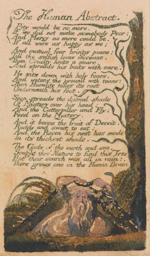 | Keywords: William Blake - Songs of Innocence and of Experience, Plate 46, "The Human Abstract" (Bentley 47) - Google Art Project.jpg print color watercolor paper cream Color-printed relief etching with watercolor on moderately thick slightly textured cream wove paper London 1757 London 1827 William male 2369124 Blake British 1757 - 1827 /collection/yale-center-for-british-art/artwork/songs-of-innocence-and-of-experience-plate-46-the-human-abstract-bentley-47-william-blake/2370336/ William Blake Artist /artist/william-blake/4130035/ 4130035 /collection/yale-center-for-british-art/ Yale Center for British Art 2305845 http //britishart yale edu/ 2/23/2012 9 37 43 PM /collection/yale-center-for-british-art/artwork/songs-of-innocence-and-of-experience-plate-46-the-human-abstract-bentley-47-william-blake/2370336/ 1794 1794 beard branches men rope leaf net text trees vines historical subject Color-printed relief etching with watercolor on moderately thick slightly textured cream wove paper 114 2370336 False 1794 3/24/2012 2 56 50 PM YCBA/lido-TMS-2523 http //collections britishart yale edu/vufind/Record/1667394 Yale Center for British Art Paul Mellon Collection print 1790 1800 Felpham Creation w67 x h114 cm 1794 False 0 5859375 Volume songs-of-innocence-and-of-experience-plate-46-the-human-abstract-bentley-47-william-blake Songs of Innocence and of Experience Plate 46 The Human Abstract Bentley 47 s 67 Inscribed in graphite upper center 32 ; in graphite lower center 46 Inscription _Signed_and_Dated Not signed not dated Not on View Color-printed relief etching with watercolor on moderately thick slightly textured cream wove paper beard branches men rope leaf net text trees vines historical subject special url_id 0wEb-mFJ0tBkHg PD-old-100-1923 1827 Songs of Experience - The Human Abstract Songs of Innocence and Experience - Copy F Google Art Project works by William Blake |