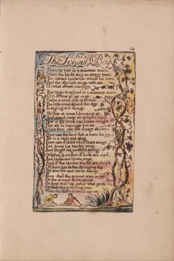 | Keywords: William Blake - Songs of Innocence and of Experience, Plate 54, "The School Boy" (Bentley 53) - Google Art Project.jpg print brown pen ink black watercolor paper cream Relief etching printed in dark-brown with pen and black ink and watercolor on moderately thick slightly textured cream wove paper London 1757 London 1827 William male 2369124 Blake British 1757 - 1827 /collection/yale-center-for-british-art/artwork/songs-of-innocence-and-of-experience-plate-54-the-school-boy-bentley-53-william-blake/2387397/ William Blake Artist /artist/william-blake/4130035/ 4130035 /collection/yale-center-for-british-art/ Yale Center for British Art 2305845 http //britishart yale edu/ 2/23/2012 9 52 52 PM /collection/yale-center-for-british-art/artwork/songs-of-innocence-and-of-experience-plate-54-the-school-boy-bentley-53-william-blake/2387397/ 1789 1789 to 1794 kneeling branches leaf boys girls men women grass text vegetation trees vines historical subject Relief etching printed in dark-brown with pen and black ink and watercolor on moderately thick slightly textured cream wove paper 111 2387397 False 1794 3/25/2012 6 19 17 PM YCBA/lido-TMS-3777 http //collections britishart yale edu/vufind/Record/1668023 Yale Center for British Art Paul Mellon Collection print 1780 1800 Felpham Creation w70 x h111 cm 1789 to 1794 False 0 66796875 Volume songs-of-innocence-and-of-experience-plate-54-the-school-boy-bentley-53-william-blake Songs of Innocence and of Experience Plate 54 The School Boy Bentley 53 s 70 Inscribed in black ink upper right 54 Inscription _Signed_and_Dated Not signed not dated Not on View Relief etching printed in dark-brown with pen and black ink and watercolor on moderately thick slightly textured cream wove paper kneeling branches leaf boys girls men women grass text vegetation trees vines historical subject special url_id igGgBN6k-4xZWA PD-old-100-1923 1827 Songs of Innocence and Experience - Copy L Google Art Project works by William Blake Songs of Experience - The School Boy |
