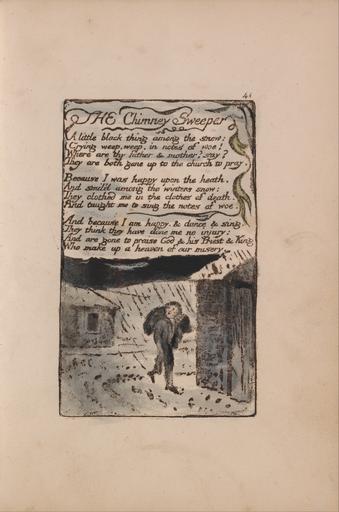 | Keywords: William Blake - Songs of Innocence and of Experience, Plate 41, "The Chimney Sweeper" (Bentley 37) - Google Art Project.jpg print brown pen ink black watercolor paper cream Relief etching printed in dark-brown with pen and black ink and watercolor on moderately thick slightly textured cream wove paper London 1757 London 1827 William male 2369124 Blake British 1757 - 1827 /collection/yale-center-for-british-art/artwork/songs-of-innocence-and-of-experience-plate-41-the-chimney-sweeper-bentley-37-william-blake/2389609/ William Blake Artist /artist/william-blake/4130035/ 4130035 /collection/yale-center-for-british-art/ Yale Center for British Art 2305845 http //britishart yale edu/ 2/23/2012 9 52 30 PM /collection/yale-center-for-british-art/artwork/songs-of-innocence-and-of-experience-plate-41-the-chimney-sweeper-bentley-37-william-blake/2389609/ 1789 1789 to 1794 rain children boy houses text vines street bag historical subject Relief etching printed in dark-brown with pen and black ink and watercolor on moderately thick slightly textured cream wove paper 111 2389609 False 1794 3/25/2012 6 24 31 PM YCBA/lido-TMS-3763 http //collections britishart yale edu/vufind/Record/1668008 Yale Center for British Art Paul Mellon Collection print 1780 1800 Felpham Creation w70 x h111 cm 1789 to 1794 False 0 662109375 Volume songs-of-innocence-and-of-experience-plate-41-the-chimney-sweeper-bentley-37-william-blake Songs of Innocence and of Experience Plate 41 The Chimney Sweeper Bentley 37 s 70 Inscribed in black ink upper right 41 Inscription _Signed_and_Dated Not signed not dated Not on View Relief etching printed in dark-brown with pen and black ink and watercolor on moderately thick slightly textured cream wove paper rain children boy houses text vines street bag historical subject special url_id DAHiRvgavNo58A PD-old-100-1923 1827 Songs of Innocence and Experience - Copy L Google Art Project works by William Blake |