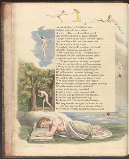 | Keywords: William Blake - Young's Night Thoughts, Page 4, "What, though my soul fantastick measures trod" - Google Art Project.jpg ~ 1797 etching line engraving watercolor paper cream Etching and line engraving with watercolor on moderately thick slightly textured cream wove paper London 1757 London 1827 William male 2369124 Blake British 1757 - 1827 /collection/yale-center-for-british-art/artwork/youngs-night-thoughts-page-4-what-though-my-soul-fantastick-measures-trod-william-blake/2356621/ William Blake Artist /artist/william-blake/4130035/ 4130035 /collection/yale-center-for-british-art/ Yale Center for British Art 2305845 http //britishart yale edu/ 2/23/2012 9 34 34 PM /collection/yale-center-for-british-art/artwork/youngs-night-thoughts-page-4-what-though-my-soul-fantastick-measures-trod-william-blake/2356621/ 1792 ca 1797 branches sleeping men women swimming text trees quill pen nudes historical subject book Etching and line engraving with watercolor on moderately thick slightly textured cream wove paper 425 2356621 False 1802 3/25/2012 8 57 16 PM YCBA/lido-TMS-2304 http //collections britishart yale edu/vufind/Record/1667263 Yale Center for British Art Paul Mellon Collection print 1790 1810 Felpham Creation w318 x h425 cm ca 1797 False 0 814453125 Volume youngs-night-thoughts-page-4-what-though-my-soul-fantastick-measures-trod-william-blake Young's Night Thoughts Page 4 What though my soul fantastick measures trod y 318 No inscription Inscription _Signed_and_Dated Not signed not dated Not on View Etching and line engraving with watercolor on moderately thick slightly textured cream wove paper branches sleeping men women swimming text trees quill pen nudes historical subject book special url_id 0gFS33OUegnUow PD-old-100-1923 1827 William Blake's illustrations to Young's Night Thoughts Google Art Project works by William Blake |