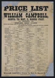 | Keywords: text document writing Arrangement of text. Lists prices for teas, sugars, golden syrup, treacle, cornflour, biscuits, dried fruits, tinned fruits, starch, flour, matches, candles, blacking, blue, marmalade, jams, infants' food, kerosene, soaps, candied peel, currie and pickles, preserved fish, potted meats, condensed milk, jellies, spices, mustard, salt, baking powder, cocoas, coffee, cordials, brooms, brushes, etc. Quantity: 1 b&w photo-mechanical print(s). Physical Description: Letterpress 393 x 275 mm. Provenance: Donated by Dr Les Cleveland in 1996. Cleveland, Francis Leslie, 1921-2014. William Campbell, Oriental Tea Mart :Price list, March 1895.. Ref: Eph-C-RETAIL-1895-01. Alexander Turnbull Library, Wellington, New Zealand. natlib.govt.nz/records/22744244 Arrangement of text. Lists prices for teas, sugars, golden syrup, treacle, cornflour, biscuits, dried fruits, tinned fruits, starch, flour, matches, candles, blacking, blue, marmalade, jams, infants' food, kerosene, soaps, candied peel, currie and pickles, preserved fish, potted meats, condensed milk, jellies, spices, mustard, salt, baking powder, cocoas, coffee, cordials, brooms, brushes, etc. Quantity: 1 b&w photo-mechanical print(s). Physical Description: Letterpress 393 x 275 mm. Provenance: Donated by Dr Les Cleveland in 1996. Cleveland, Francis Leslie, 1921-2014. William Campbell, Oriental Tea Mart :Price list, March 1895.. Ref: Eph-C-RETAIL-1895-01. Alexander Turnbull Library, Wellington, New Zealand. natlib.govt.nz/records/22744244 |