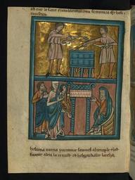 Keywords: William de Brailes - Top - Eli's Sons Commit Sacrilege (1 Samuel 2 -13-17) - Walters W10617V - Full Page.jpg Walters Art Museum artwork Creator William de Brailes This page from Walters manuscript W 106 depicts scenes from the story of Samuel Top The priest Eli's sons Hophni and Phinehas were also priests at the temple and they took sacrifices that had been made at teh temple before the fat had been burned; they wanted it raw The sin that they committed was very great in the eyes of God Bottom When Samuel was weaned Hannah and Elkanah brought him to the temple ca 1250 Medieval ink pigment parchment cm 13 2 9 5 accession number W 106 17V 12981 Léon Gruel Paris date and mode of acquisition unknown Henry Walters Baltimore June 6 1903 by purchase see The Diaries of George Lucas Walters Art Museum Henry Walters Acquired by Henry Walters 1903 Translation the inscription for the TOP image has been partially cut off but the remainder reads with all the blood and they stole it God grew angry because Eli consented to it; Transliteration od tut le sanc e l'emblerent deu se curuza quar heli i cunsenti Translation the inscription BELOW the image reads Elkanah and Hannah brought Samuel to the temple and offered him to God He remained there with Eli guarding the Ark; Transliteration helcana e anna porterent samuel al temple e l'offurent a deu la remist od heli gardaunt l'arche The Bible Before Luther The Walters Art Gallery Baltimore 1992-1993 place of origin Oxford England United Kingdom Walters Art Museum license 2D Walters MS W106 - Bible Pictures by William de Brailes Eli Bible Media contributed by the Walters Art Museum needs category review Hannah mother of Samuel