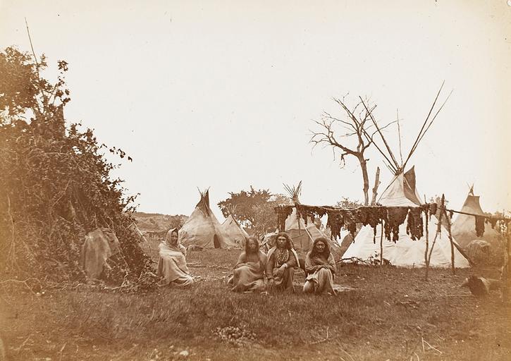 | Keywords: William S. Soule - Arapaho camp.jpg ; Arapaho camp Four Men in Native Dress in Camp; Meat Drying on Rack Brush Structure and Tipis Nearby 1869 <ref>National Anthropological Archives Smithsonian Institution http //siris-archives si edu/ipac20/ipac jsp uri full 3100001~ 39171~ 5 SPC BAE 3912-B Vol 1 01156900</ref> This photograph is said to be of an Arapaho camp near Camp Supply The picture was taken by Soule in 1870 The band camped here had just completed a successful buffalo hunt for there is meat hanging to dry both in the foreground and also just over the head of the man wrapped in the blanket on the left The reason for the large pile of brush is not known It may have been built as a wind-break or sun shade although for the latter purpose an arbor was usuallly erected so that the air could circulate Smithsonian Institution Bureau of American Ethnology In Wilbur Sturtevant Nye Plains Indian raiders the final phases of warfare from the Arkansas to the Red River with original photographs by William S Soule University of Oklahoma Press 1st edition 1968 ISBN 0806111755 p340 Retrieved from National Anthropological Archives Smithsonian Institution http //siris-archives si edu/ipac20/ipac jsp uri full 3100001~ 39171~ 5 SPC BAE 3912-B Vol 1 01156900 Wilbur Sturtevant Nye Plains Indian raiders the final phases of warfare from the Arkansas to the Red River with original photographs by William S Soule University of Oklahoma Press 1st edition 1968 ISBN 0806111755 p341 1870 Creator William S Soule reflist PD-old-auto-1923 1908 Arapaho Oklahoma in the 1870s William S Soule Meat cuts Tipis |