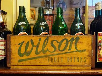 | Keywords: Wilson Fruit drinks crate with empty bottles, pic1.JPG Photographed at the Museum in den Halven Maen The Netherlands Photo of a very old product that is not produced and not sold anymore own 2014-08-03 12 35 34 Alf van Beem CC-zero Trademarked Museum in den Halven Maen Wooden containers |