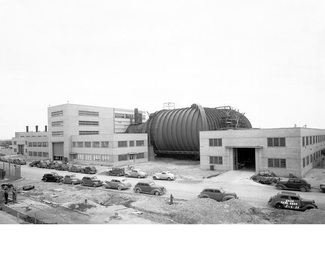 | Keywords: blackandwhite monochrome outdoor black and white Full Description: The Altitude Wind Tunnel at the Aircraft Engine Research Laboratory (now NASA Glenn Research Center) in Cleveland, OH, under construction in 1944. View taken facing southeast, showing scaffolding for refrigerant line construction to west end of tunnel, and application of insulation material on throat section. UID: SPD-GRIN-GPN-2000-00 0343 Date: May 5, 1944 Full Description: The Altitude Wind Tunnel at the Aircraft Engine Research Laboratory (now NASA Glenn Research Center) in Cleveland, OH, under construction in 1944. View taken facing southeast, showing scaffolding for refrigerant line construction to west end of tunnel, and application of insulation material on throat section. UID: SPD-GRIN-GPN-2000-00 0343 Date: May 5, 1944 |