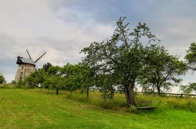 Keywords: windmill mill old antique nostalgia tree bank bench wooden bench