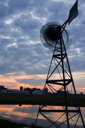 Keywords: windmill sunset clouds farm agriculture dusk energy landscape turbine power propeller wind reflection pond water rural