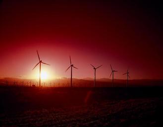Keywords: windmills turbines electricity power sunset energy sky dusk evening technology propeller landscape sun silhouettes