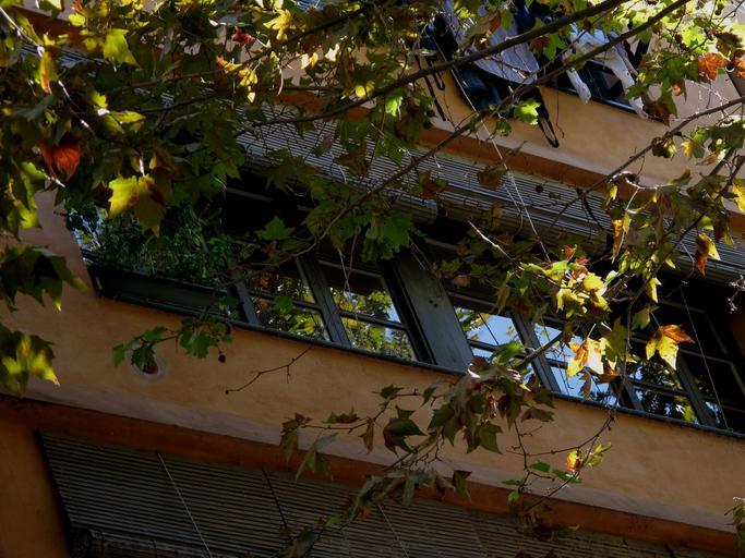 Keywords: window reflection branches leaves tan-colored girona spain europe building wall southern europe