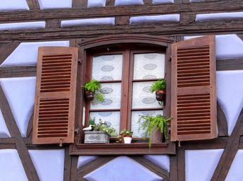 Keywords: window shutters truss flowerpot brown white old town historically home fachwerkhaus alsace colmar picturesque individual france
