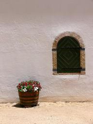 Keywords: window wall whitewashed flowers barrel exterior house residence stucco building structure blank residential domestic property decor outdoor