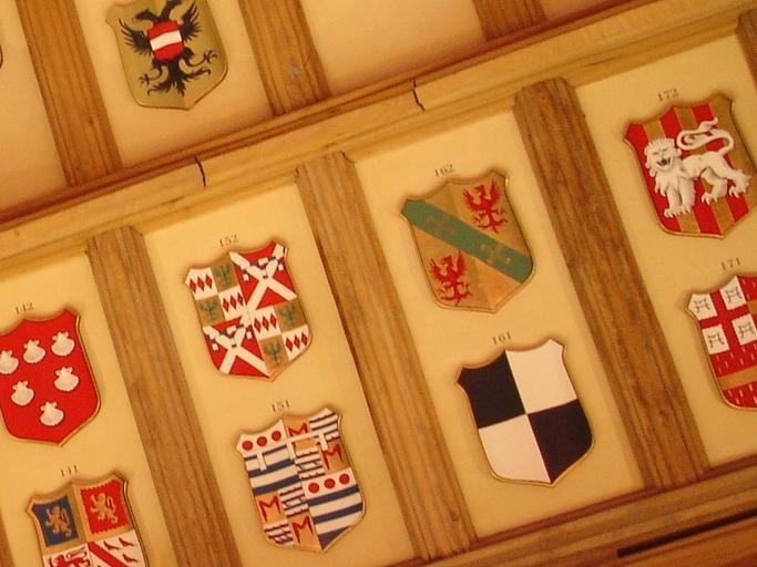 | Keywords: WindsorStGeorgeHallAlmadaCoatOfArms.jpg Coats of arms of Knights of the Garter on the ceiling of St George's Hall Windsor Castle Top left Albert V of Austria; 142 Lord Scales; 152 Richard Neville Earl of Salisbury; 162 Alvaro d'Almada Count of Avranches; 172 presumably Sir Edward Hull Paly Gules and Or a lion statant guardant Argent ; 141 John Talbot Earl of Shrewsbury; 151 Sir John Grey; 161 Sir Thomas Hoo; 171 Lord Bourchier Own 2005-04-11 Aalmada Public domain Knights of the Garter 15th century Coats of arms of English nobility Coats of arms of Austrian nobility Order of the Garter in heraldry Coats of arms of Almadas Interior of Windsor Castle Paintings of coats of arms |