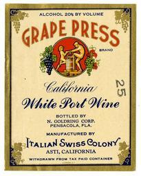| Keywords: text writing photo border sign Repository: California Historical Society Collection: California wine label and ephemera collection Date: undated Call Number: Kemble Spec Col 07 Digital Object ID: Kemble Spec Col 07_014.jpg Preferred Citation: Wine label, Italian Swiss Colony, Grape Press Brand California White Port Wine, California wine label and ephemera collection, Kemble Spec Col 07, courtesy, California Historical Society, Kemble Spec Col 07_014.jpg. Repository: California Historical Society Collection: California wine label and ephemera collection Date: undated Call Number: Kemble Spec Col 07 Digital Object ID: Kemble Spec Col 07_014.jpg Preferred Citation: Wine label, Italian Swiss Colony, Grape Press Brand California White Port Wine, California wine label and ephemera collection, Kemble Spec Col 07, courtesy, California Historical Society, Kemble Spec Col 07_014.jpg. |