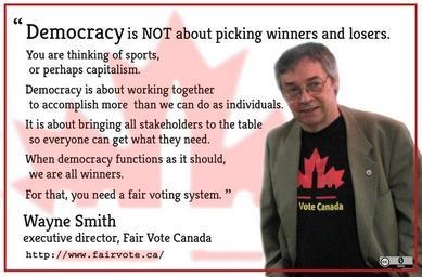 | Keywords: wayne smith waynesmith democracy proportional representation proportionalrepresentation canada fair vote canada fairvotecanada people text "Democracy is NOT about picking winners and losers. You are thinking of sports, or perhaps capitalism. Democracy is about working together to accomplish more than we can do as individuals. It is about bringing all stakeholders to the table so everyone can get what they need. When democracy functions as it should, we are all winners. For that, you need a fair voting system" ~ Wayne Smilth I made this before the last Fair Vote Canada executive changeover. Although Wayne isn't the Executive Director anymore, this is still a brilliant quotation. find out about FVC at www.fairvote.ca/ "Democracy is NOT about picking winners and losers. You are thinking of sports, or perhaps capitalism. Democracy is about working together to accomplish more than we can do as individuals. It is about bringing all stakeholders to the table so everyone can get what they need. When democracy functions as it should, we are all winners. For that, you need a fair voting system" ~ Wayne Smilth I made this before the last Fair Vote Canada executive changeover. Although Wayne isn't the Executive Director anymore, this is still a brilliant quotation. find out about FVC at www.fairvote.ca/ |