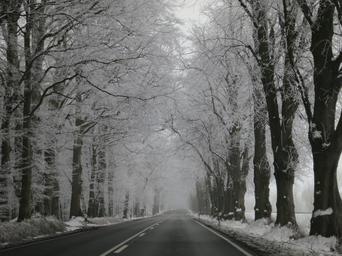 Keywords: winter avenue snow away wintry snowy trees lindenallee tree lined avenue hoarfrost fog